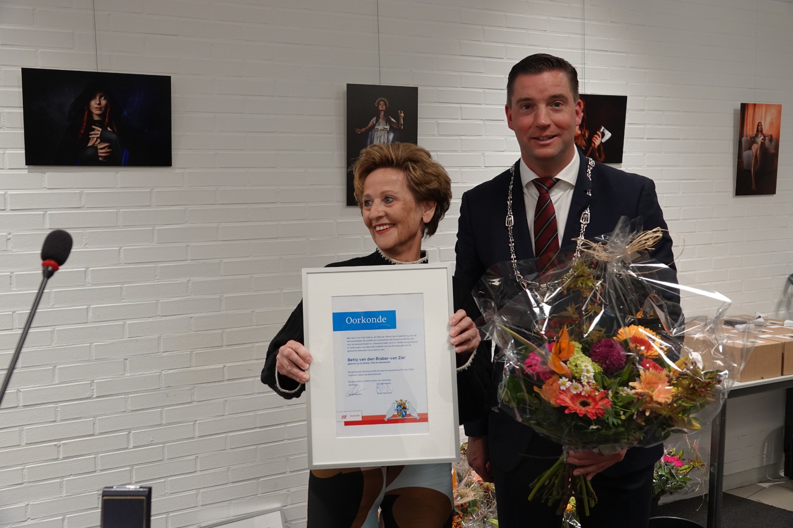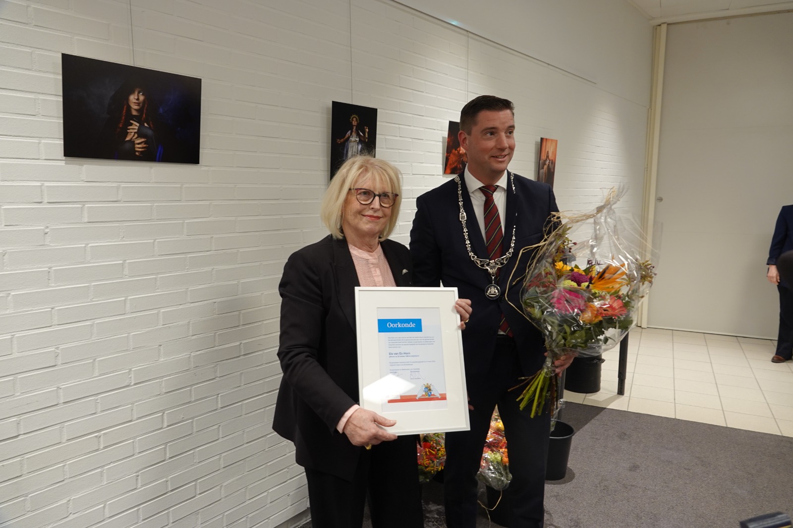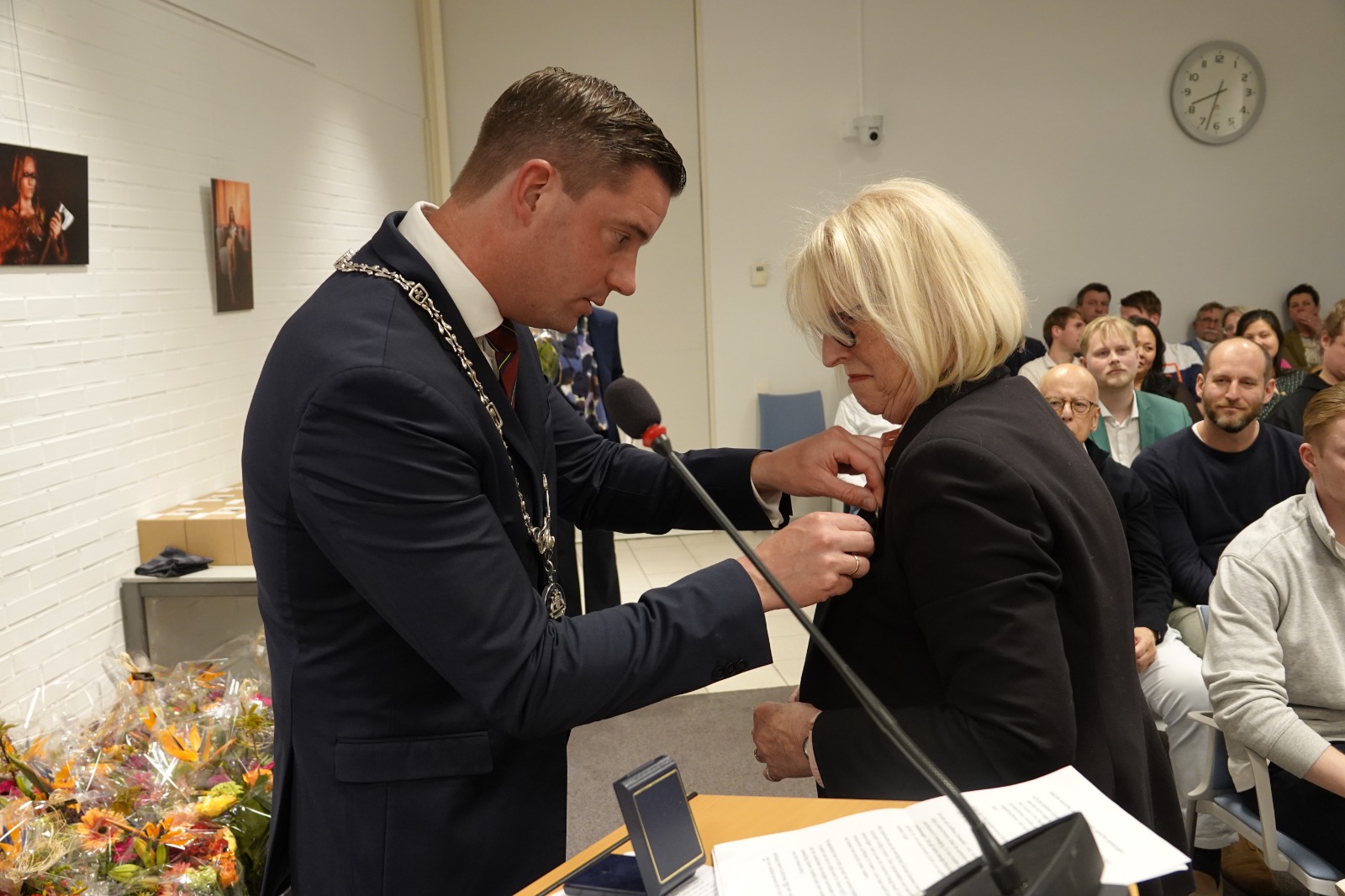 Betty van den Braber en Els van Es kregen van burgemeester Bram Harmsma de waarderingsspeld voor 8 jaar, 2 termijnen gemeenteraad.