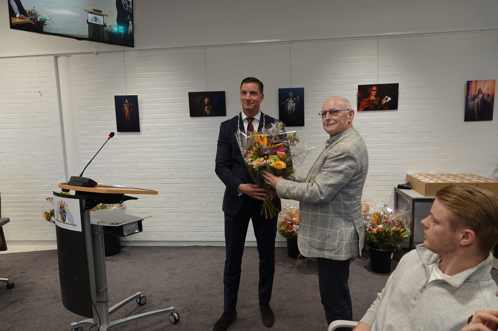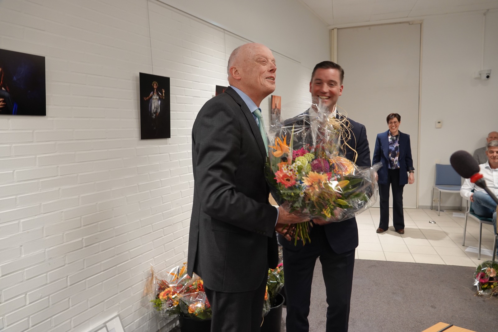 Theun Schaaf, Manno Jonker en Hans Visser kregen voor 1 termijn raadslidmaatschap bloemen.