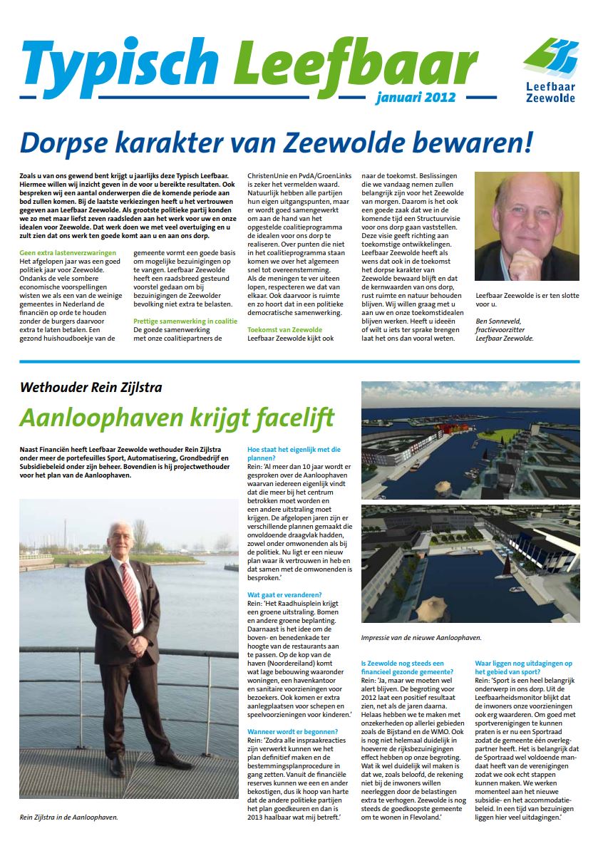 Het afgelopen jaar was een goed politiek jaar voor Zeewolde. Ondanks de vele sombere economische voorspellingen wisten we als een van de weinige gemeentes in Nederland de financiën op orde te houden zonder de burgers daarvoor extra te laten betalen. Een ezond huishoudboekje van de gemeente vormt een goede basis om mogelijke bezuinigingen op te vangen. Leefbaar Zeewolde heeft een raadsbreed gesteund voorstel gedaan om bij bezuinigingen de Zeewolder bevolking niet extra te belasten.
